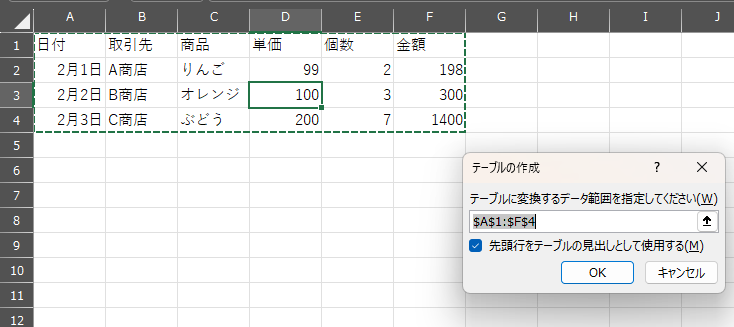 Ctrlを押しながらTを押すと「テーブルの作成ダイアログボックス」が表示されるので「OK」をクリック。