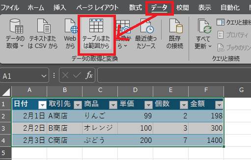 ワークシートの「データ」→「テーブルまたは範囲から」をクリックすると、
