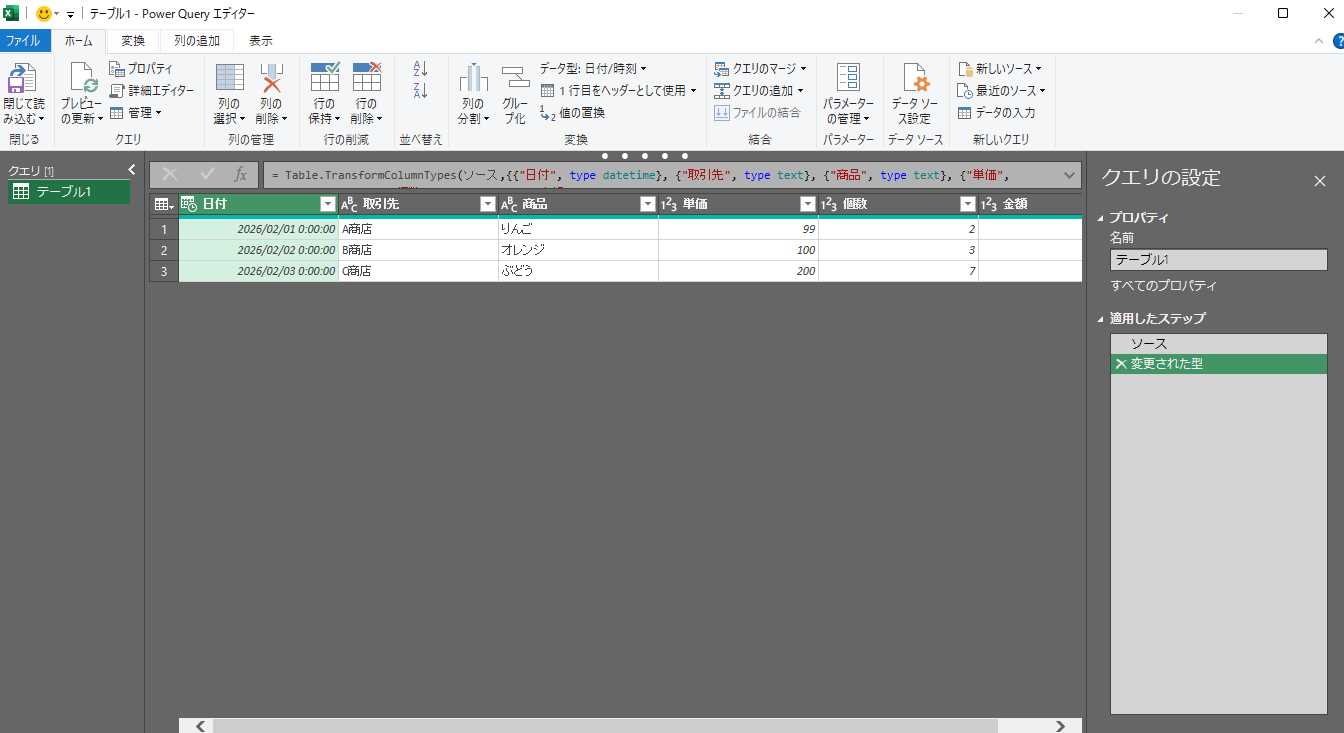 PowerQueryエディターが立ち上がり、クエリ「テーブル1」が作成されました。