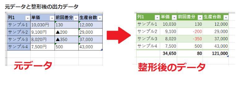 修正前は、数値データに、「円」、「▲(マイナス表記)」、「,(カンマ)」が文字列として入力されています。そのため、SUM関数を使って合計値を求めようとするとエラーとなってしまいます。